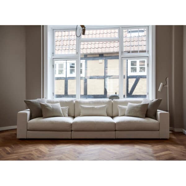 En modulsofa med generøse mål, dejlige omfavnende puder der giver en fantastisk komfort. Er man til store lounge sofaer med god dybde er Moment modulsofaen fra Saxo Living den du søger. Dybden på 110cm betyder man har en sofa der indbyder til man kravler op i den. Moment består af få enkle moduler og du vælger frit hvordan du selv ammensætter din personlige modulsofa ! Saxo Living Moments – 310cm – Rhythm 102 Ecru Pris for 3 moduler i Valgfri farve Rhythm Stof – Martindale 100.000Inkl. rygpuder men excl evt pyntepuder og pouf3 modulstørrelser, kontakt os gerne for mere info